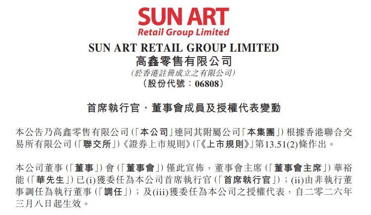 同期,高鑫零卖董事会主席华裕能已获委任为公司首席推论官、由非推论董事调任为推论董事,并获委任为本公司之授权代表,自3月8日起收效。