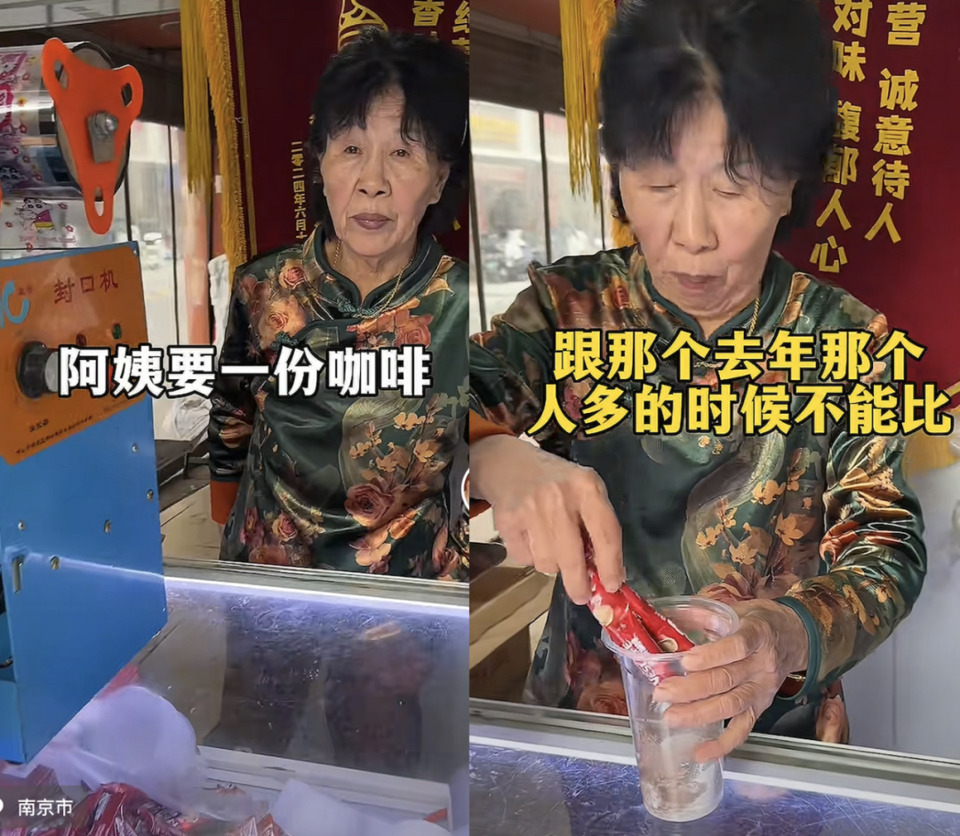 与鸭头小哥比拟,南京的咖啡大姨面对流量的气象更缓慢。客岁她因售卖10元3条的雀巢速溶咖啡而走红积蓄,被网友称为咖啡大姨。