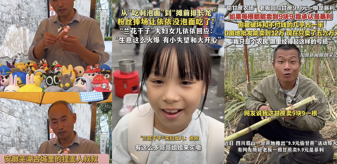 2025年被好多东说念主戏称为草根网红元年,好多摆摊商贩因为短视频的传播一炮而红。比如因儿子在直播视频中吃自家摊位剩食,被赞干净而走红的“兰花干子老婆”、因9.9“脚本杀农场”爆火的甘蔗哥、因爆持潮流玩偶走红的58岁“持面主办东说念主”……