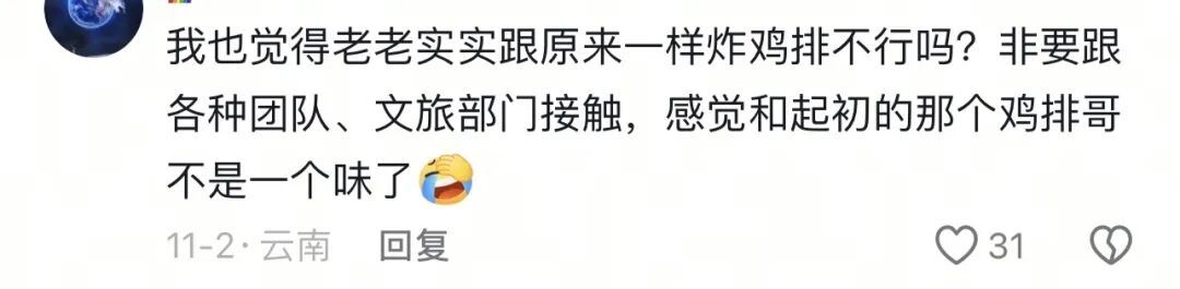 天然也有网友合计,鸡排哥在走红后依然都备脱离了他本来的使命。他不仅要应付弘大的使命量,还要配合文旅实行、吸收媒体采访,同期得志粉丝对金句和心境价值的期待。