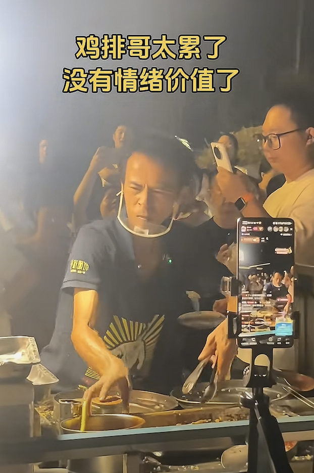 流量巅峰期,鸡排哥的摊位前每天上演中邪幻场景:网红举入部下手机直播,搭客列队拍照,土产货东说念主思要买一份鸡排已是难上加难。鸡排哥就像一个永动机一样不断地在费力,还要在油锅的热气间保持“心境价值”的输出。